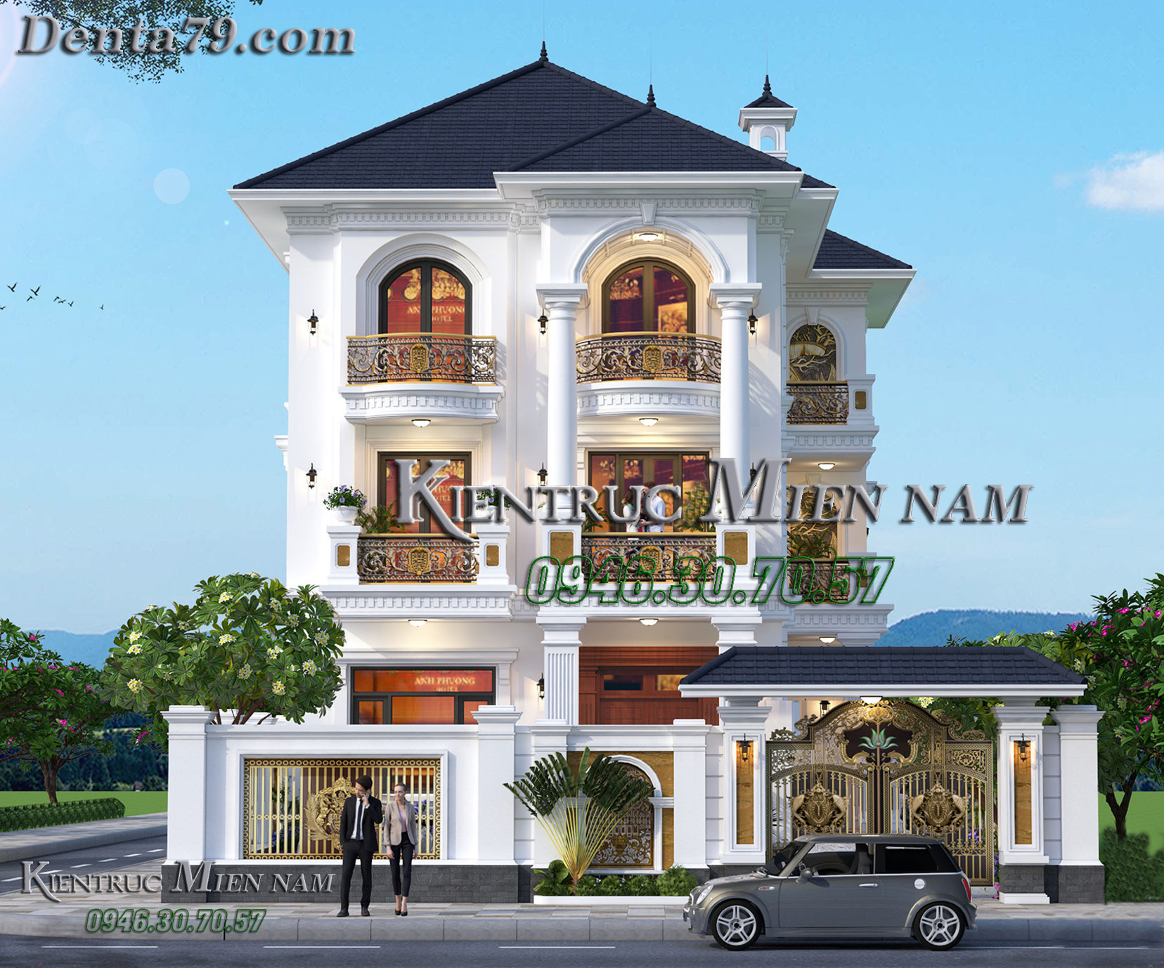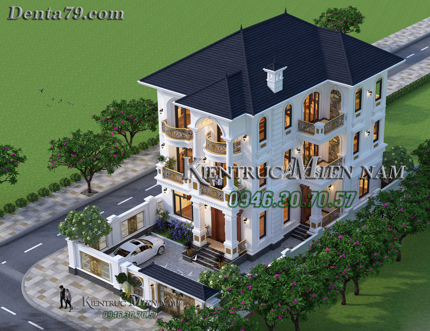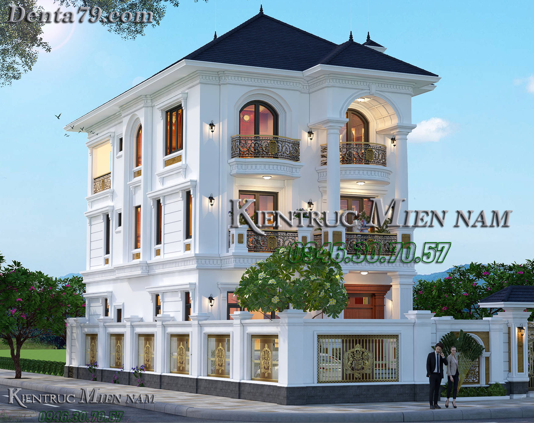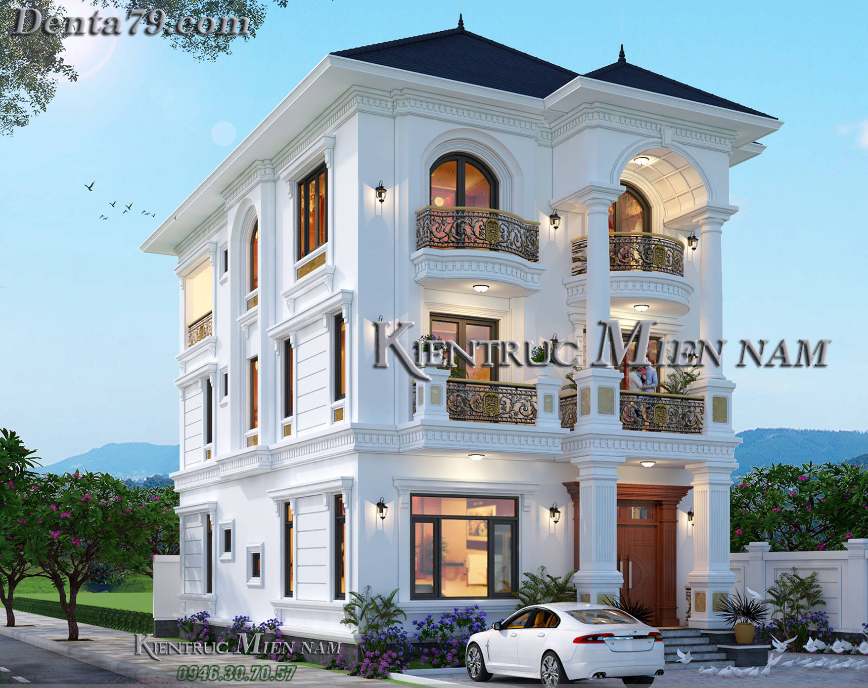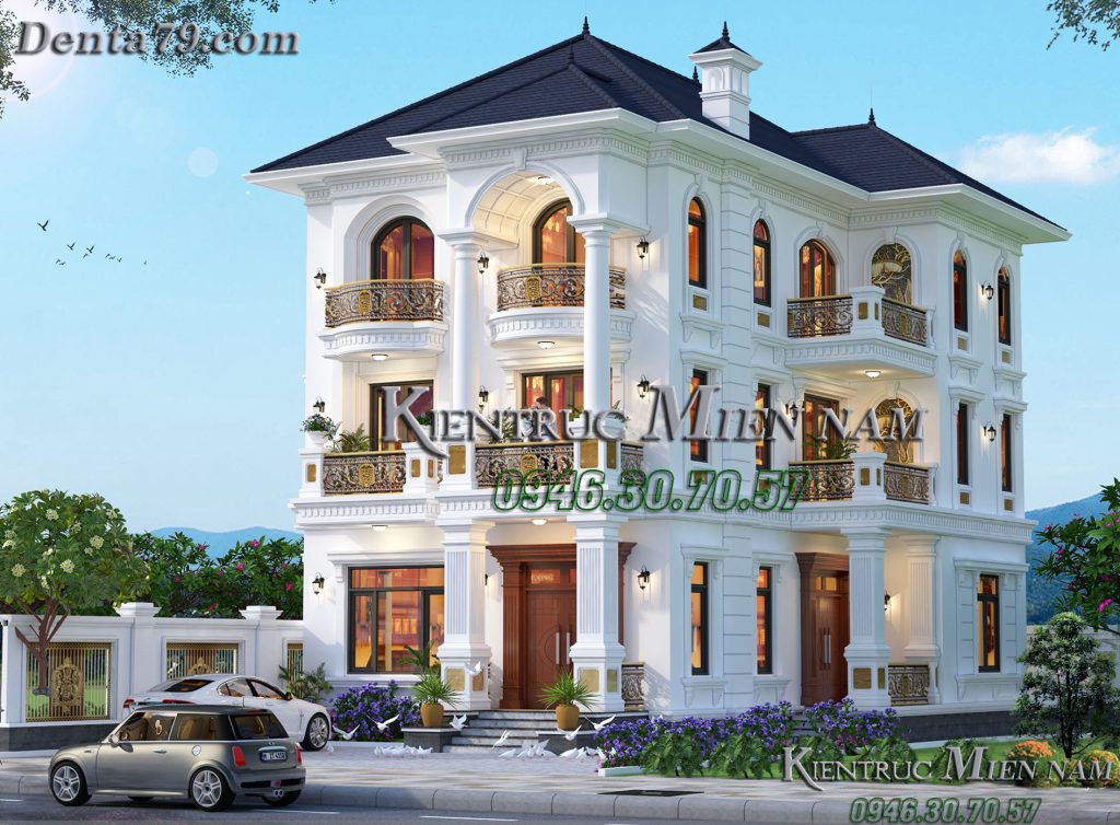 Mái ngói màu xanh dương kết hợp cùng tone màu trắng sứ nhẹ nhàng sẽ tạo nên sự liên kết nổi bật và hơi hướng hiện đại. Ngoài ra, ngôi nhà còn được sử dụng màu ghi tạo điểm nhấn trên các phần phân tầng, đầu cột. Thân nhà còn được bật lên bởi những gờ đắp nổi chạy xung quanh thân nhà và tạo điểm nhấn mạnh cho các hệ thống cửa sổ.