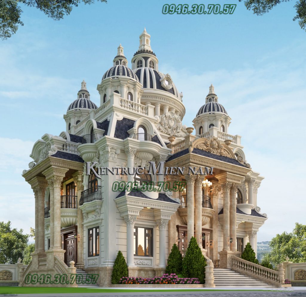 Lâu đài 10 tỷ xây dựng 3 tầng tại miền nam với diện tích trên 1000 m2 sàn. được xây dựng 3 tầng đồ sộ, với mặt tiền 30m trên đất 30m x 42m kết hợp lối kiến trúc Pháp Phục Hưng và kiến trúc La Mã vĩ đại; Lâu đài là công trình hoành tráng, uy nghi với bố cục kiến trúc cân đối cổ điển đậm chất điêu khắc. Thiết kế bố cục cân đối tạo thế uy nghiêm, vững chãi kết hợp những chi tiết hoa văn tân cổ sang trọng bề thế gây ấn tượng về sức mạnh, quyền lực, tạo cảm giác bền vững, lâu dài cho không gian ngoại thất vẻ đẹp huyền bí. Công trình thay gia chủ khẳng định vị thế bản thân và đẳng cấp gia tộc.