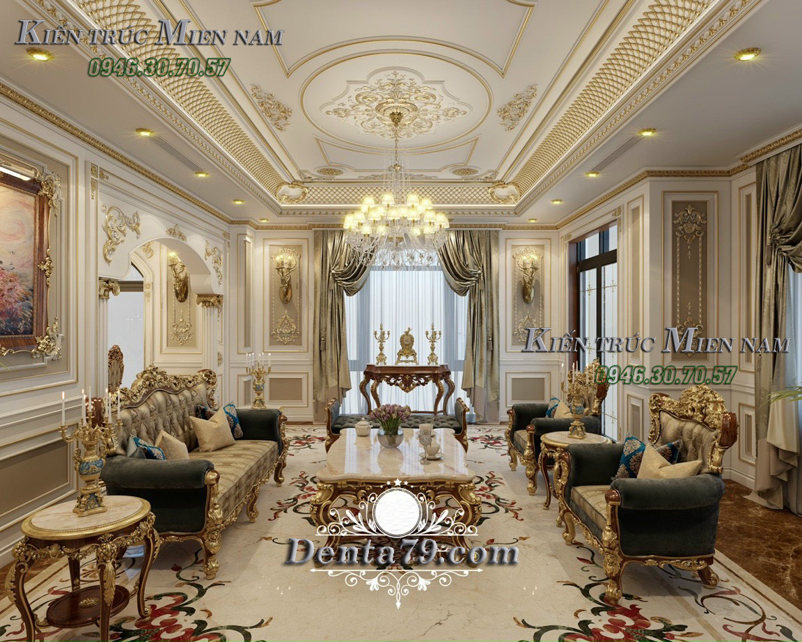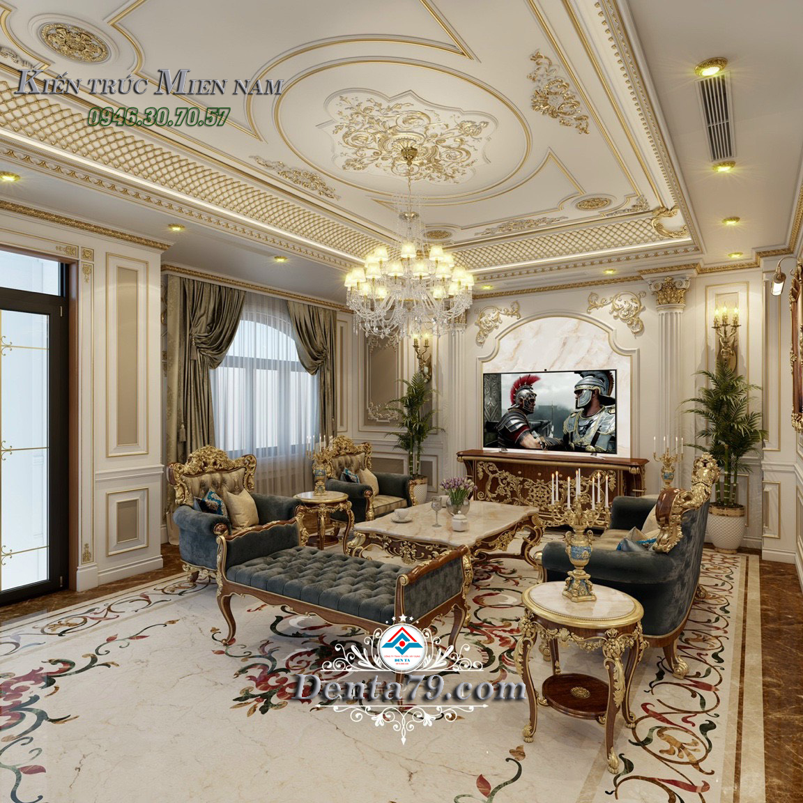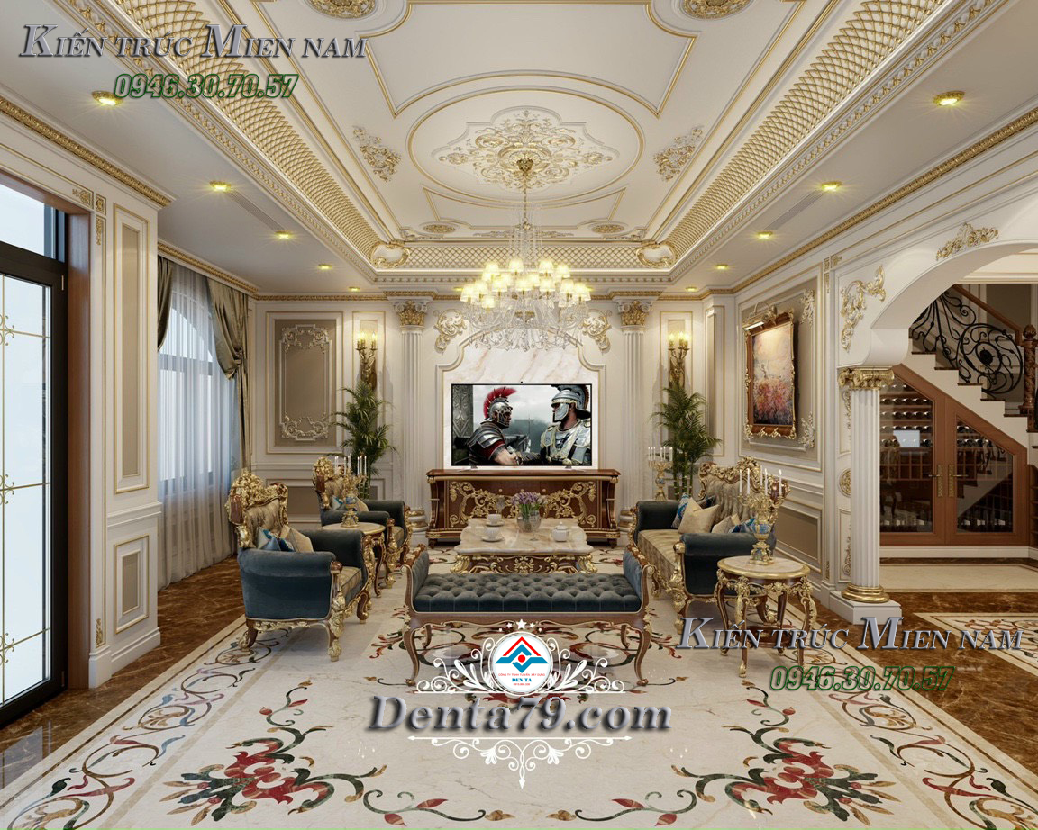 Các chi tiết trang trí phòng khách biệt thự cổ điển nhà anh Quý đánh giá cao bởi tính thẩm mỹ, cũng như tương đồng với các chi tiết ngoại thất của ngôi nhà.