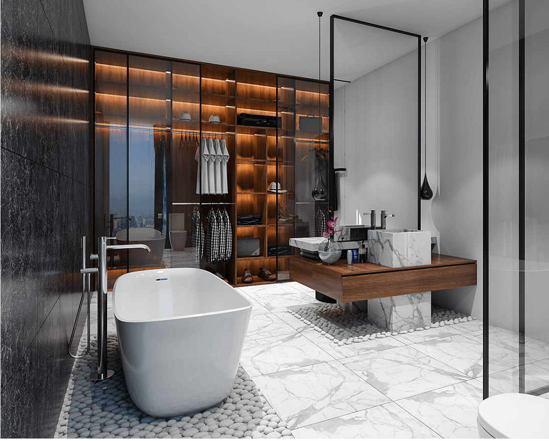 Phòng tắm nằm ngay trong phòng ngủ. Ý tưởng này không mới những vẫn là một xu hướng thịnh hành do sự tiện lợi và tính hiện đại của thiết kế. Cánh cửa trượt bằng kính ngăn không cho nước từ phòng tắm bắn ra bên ngoài.