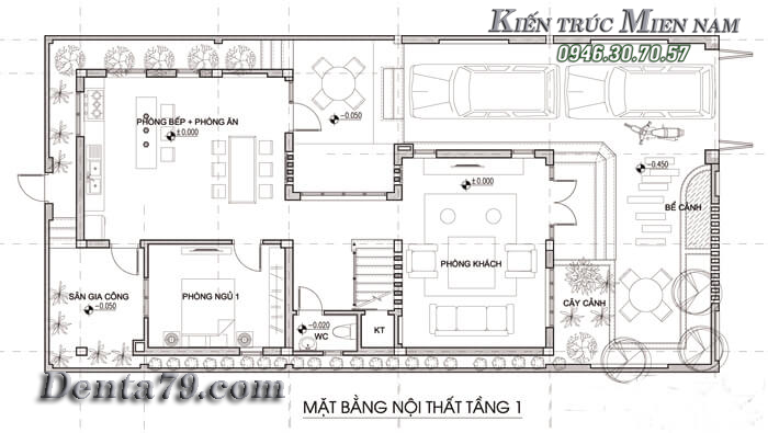 Tầng 1 gồm: Sân vườn, nhà xe, phòng khách, bếp + phòng ăn, phòng ngủ 1
