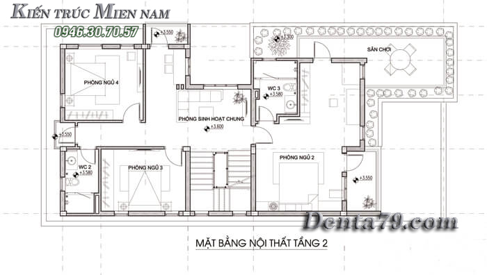 Tầng 2 gồm: Phòng sinh hoạt chung, phòng ngủ 2, phòng ngủ 3, phòng ngủ 4