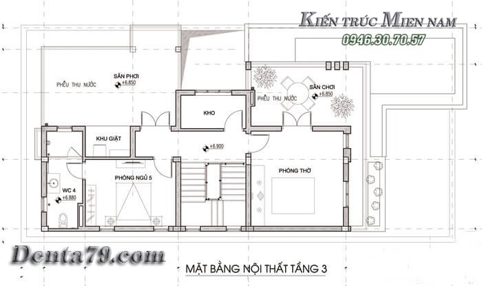 Tầng 3 gồm: Sân chơi, phòng thờ, phòng ngủ 5, khu giặt, sân phơi