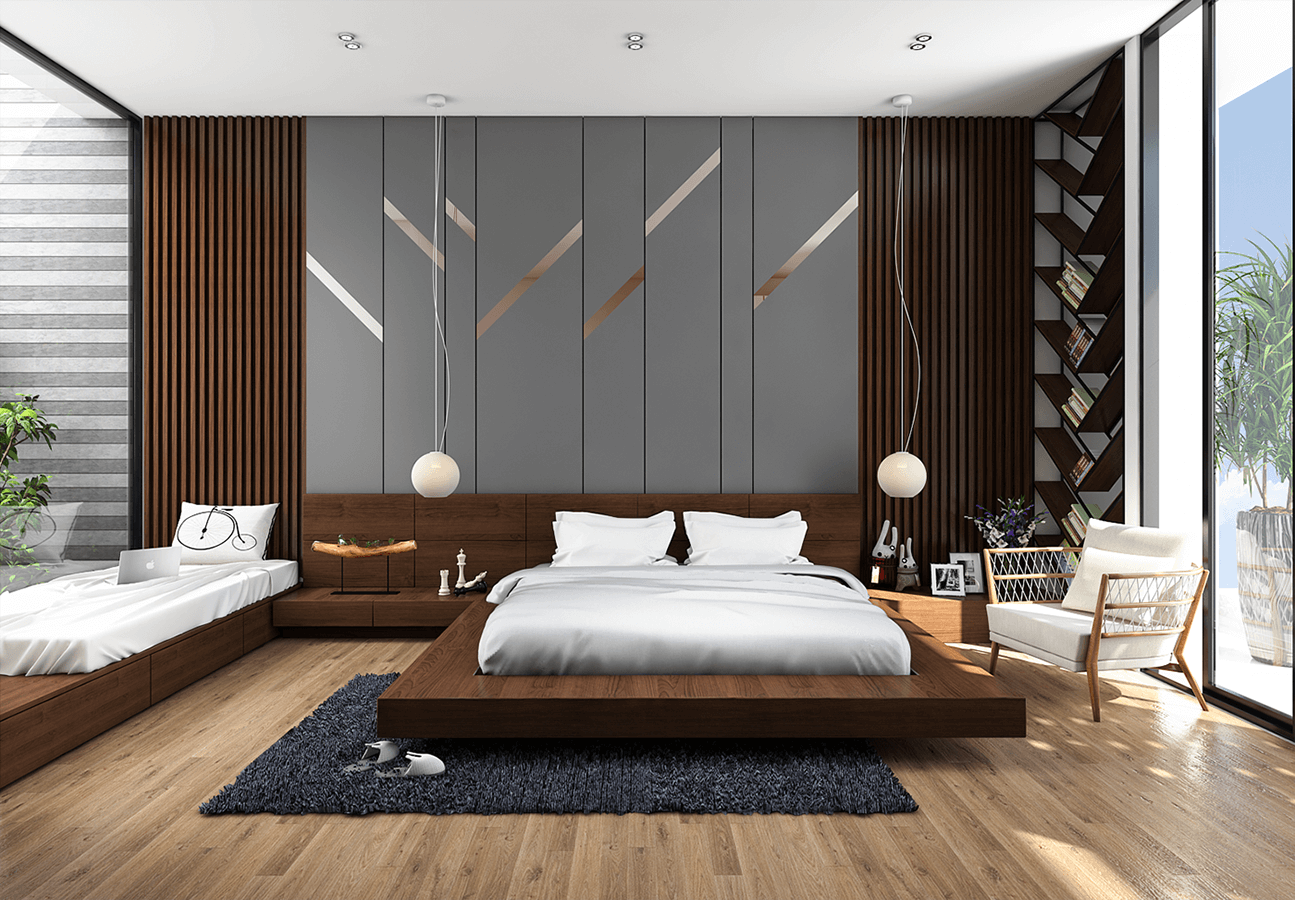Sự tinh tế trong không gian phòng ngủ được tạo thành từ chiếc giường ngủ thấp, vật dụng trang trí và nguồn sáng tự nhiên, mang lại sự cân bằng.