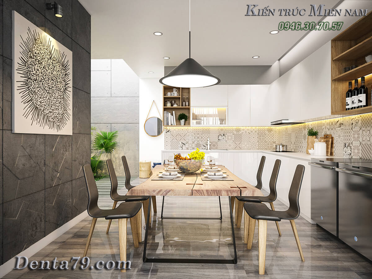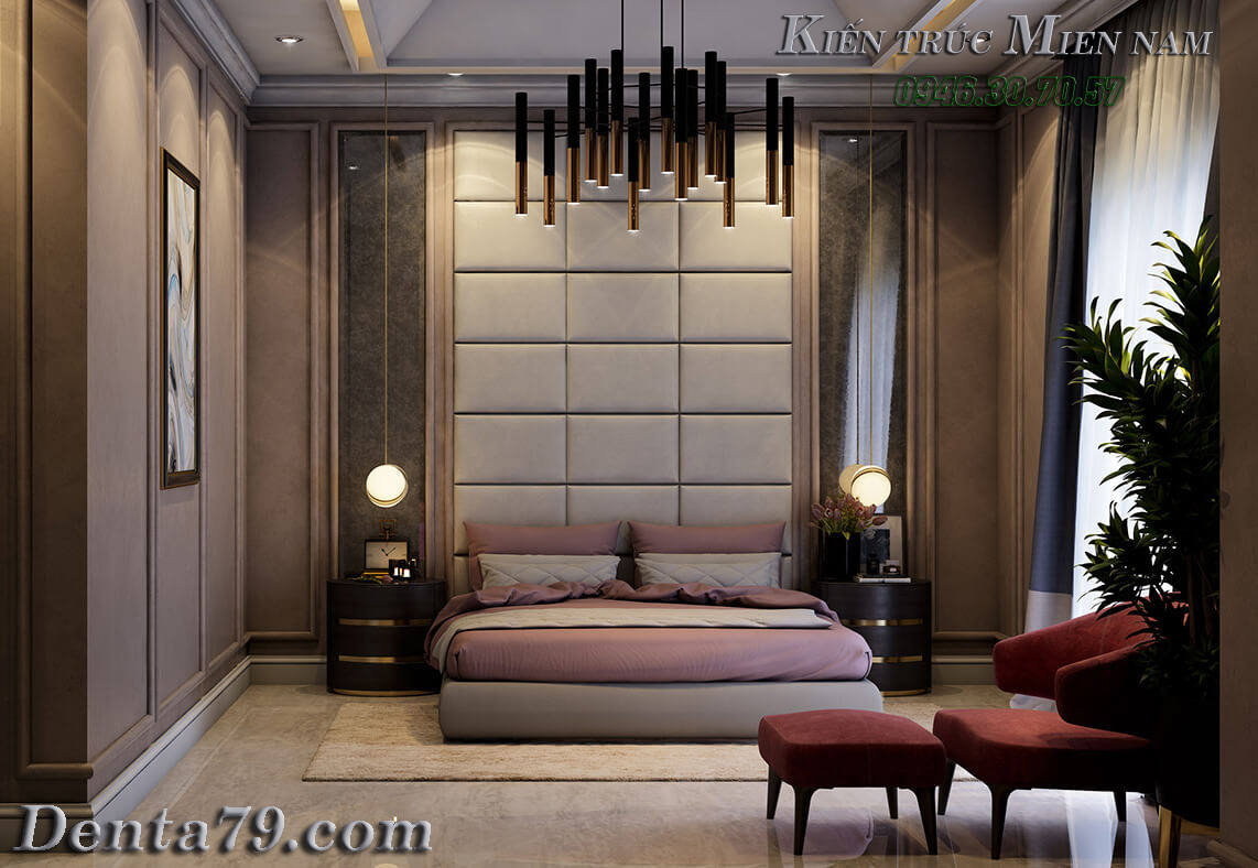 Đánh giá được tầm quan trọng của khu vực sinh hoạt chung, các kiến trúc sư nhanh chóng triển khai sơ đồ bố trí không gian phòng theo phong cách hiện đại nhưng ấm cúng, tạo sợi dây gắn kết vô hình giữa mọi người trong nhà.  Trong phòng ăn, hệ thống trần thạch cao kết hợp với đèn led âm trần chạy dọc theo chiều dài hình chữ nhật của phòng, đem lại sự cân bằng đồng thời chinh phục thị giác của người nhìn. Bếp nấu đặt cạnh đó và được tính toán khoảng cách phù hợp so với bàn   Phòng ngủ chính của mẫu biệt thự thiết kế nổi bật với các gam màu pastel, giường ngủ đặt ở trung tâm xen giữa hai chiếc tủ đầu giường nằm ở hai bên.
