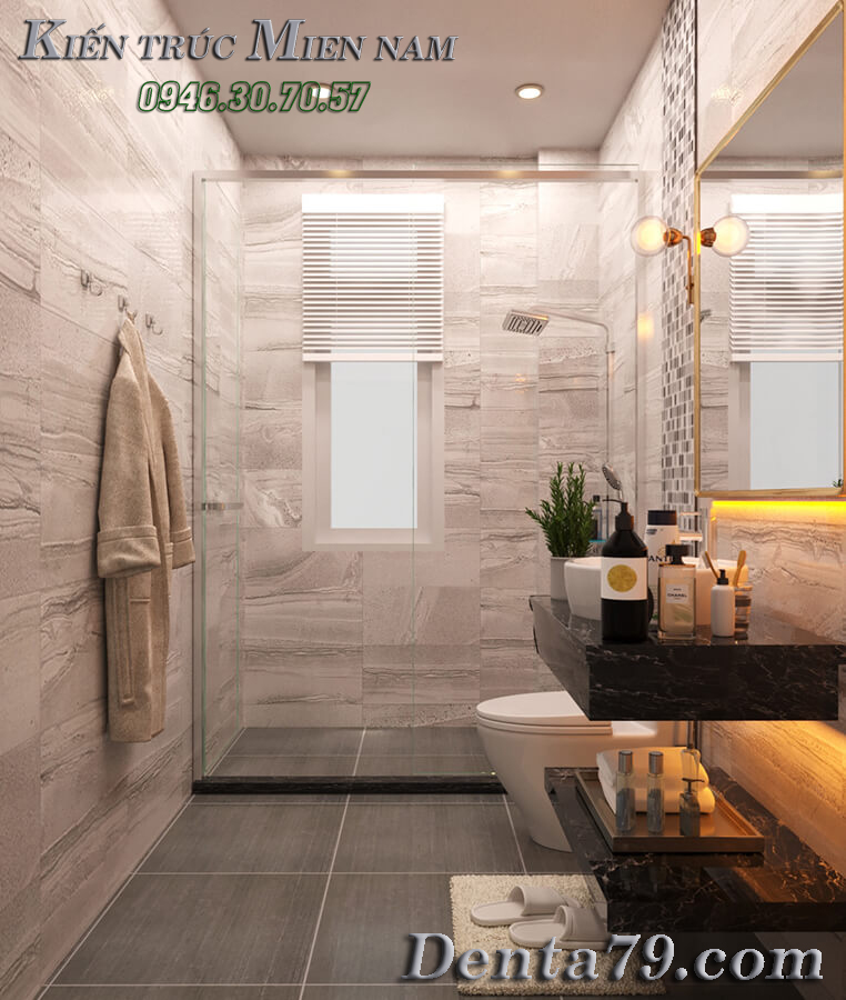 • Nhà vệ sinh chung đặt dưới cầu thang nhằm tận dụng diện tích và phù hợp với các quy tắc về phong thủy.