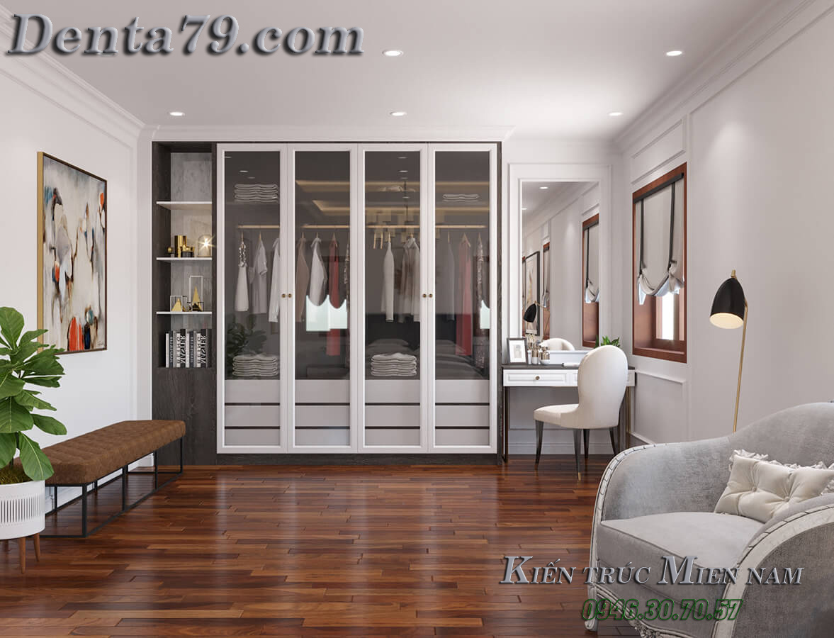Biệt thự pháp 3 tầng còn có một phòng thay đồ đẹp, khiến gia chủ tự hào. Dù nhiều đồ đạc nhưng bàn ghế, tủ kệ đều được bố trí rất hợp lý, đảm bảo các yếu tố quan trọng, cơ bản nhất trong việc bố trí nhà ở trong phong thủy.