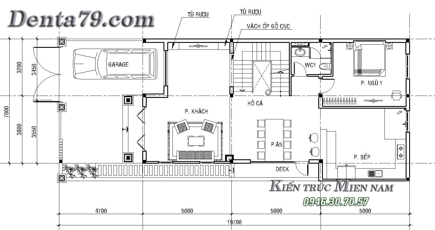 Tầng trệt gồm: Phòng khách, phòng ăn, nhà bếp, phòng ngủ 1