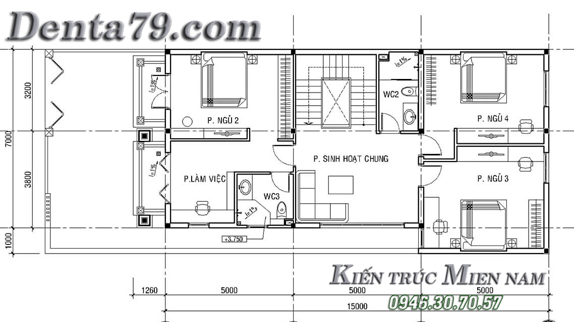 Lầu 1 gồm: Phòng sinh hoạt chung, phòng ngủ 2, phòng làm việc, phòng ngủ 3, phòng ngủ 4