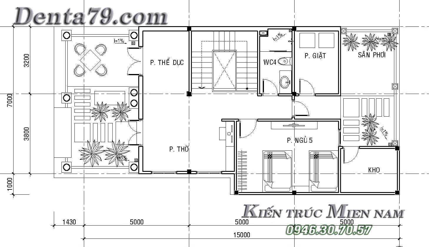 Lầu 2 gồm: Sân phơi, kho, phòng ngủ 5, phòng thể dục, phòng thờ, phòng thể dục