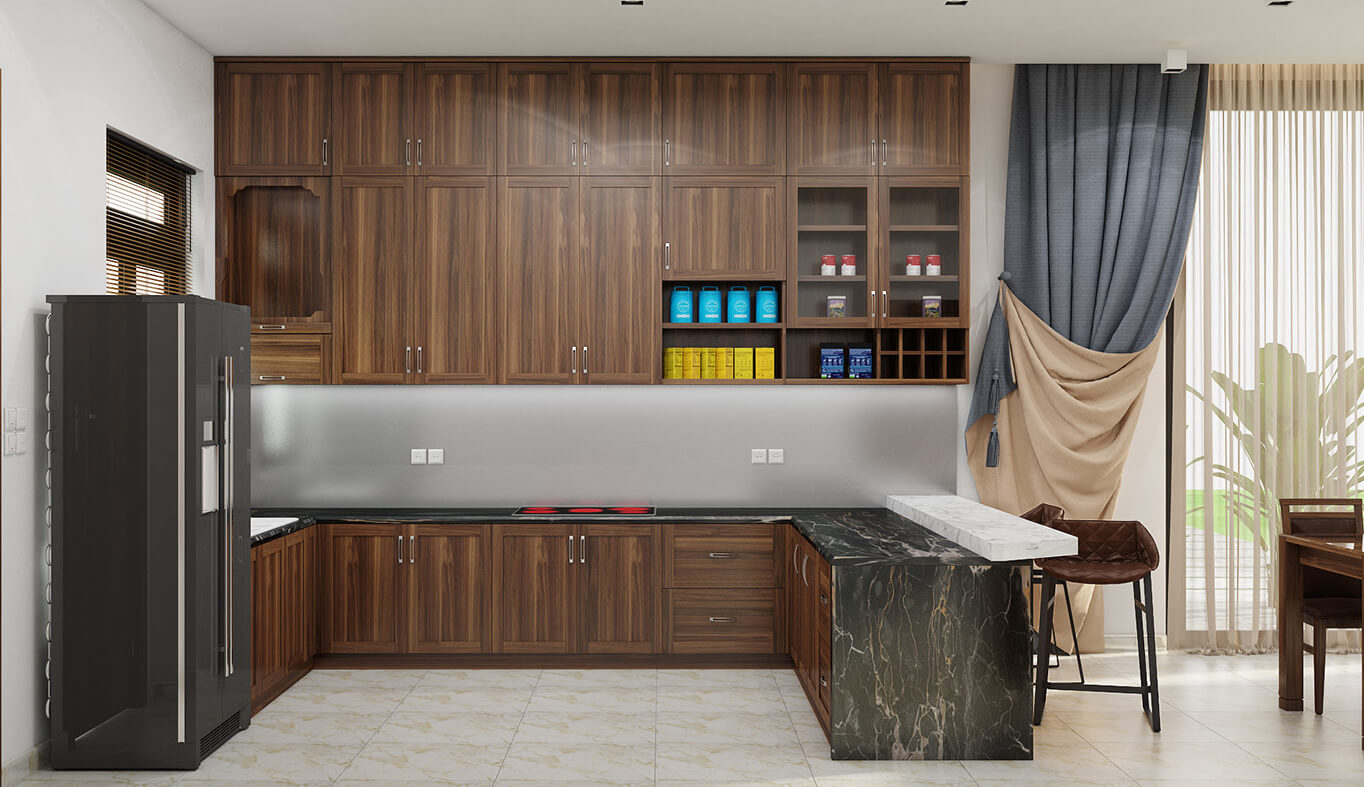 Tủ bếp chữ U có mặt làm bằng đá để dễ dàng làm sạch, giúp người nội trợ có thêm thời gian tận hưởng cuộc sống.