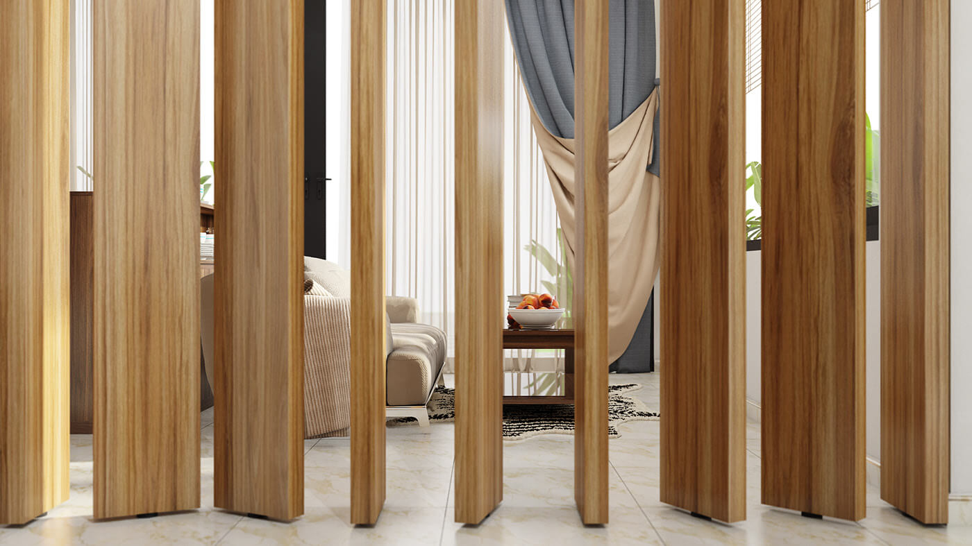 Hệ lam gỗ hình dạng lá sách đóng vai trò như một chiếc máy hút gió, giúp phòng khách lẫn phòng ăn đều nhận được gió.