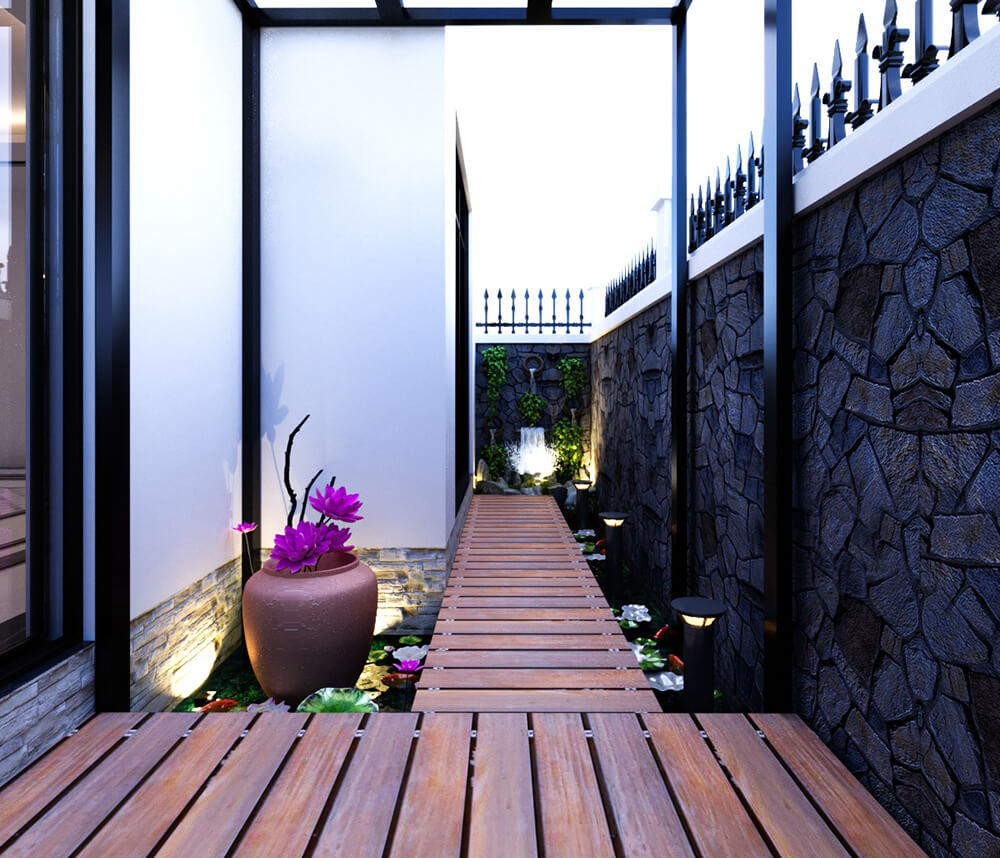 Lối đi xung quanh được ốp gỗ, giống như những cây cầu xây vắt qua khu vườn để chủ nhà tránh xa ồn ào, khói bụi.