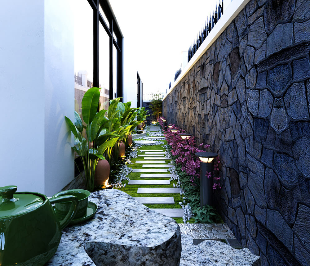 Một góc nhìn khác của lối đi xung quanh vườn. Bộ bàn ghế bằng đá để chủ nhà ngồi uống trà, mời bạn bè đến trò chuyện, tâm tình