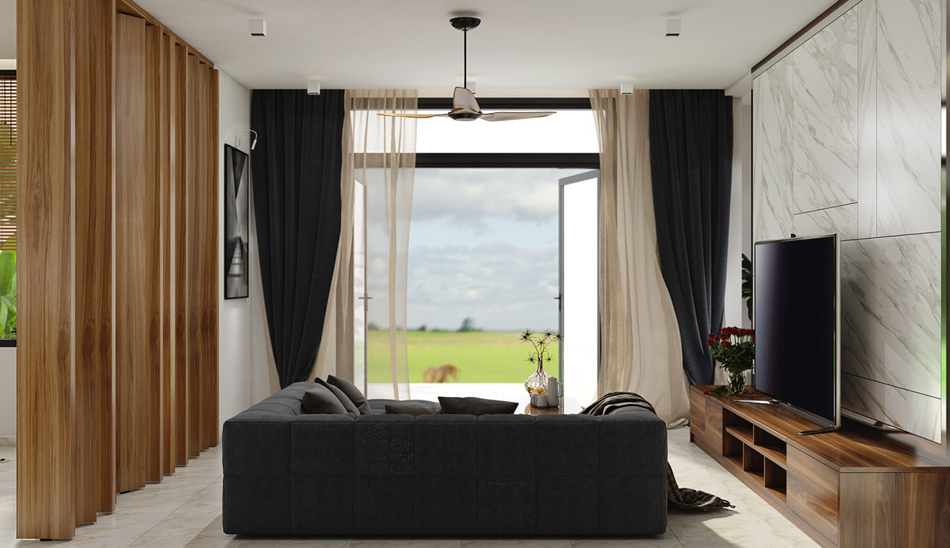 - Không gian đầu tiên là phòng khách rộng 29m2, để thiên nhiên và ánh sáng có thể tràn vào phòng bất cứ lúc nào nên phòng khách được đặt ngay sau sảnh vào.