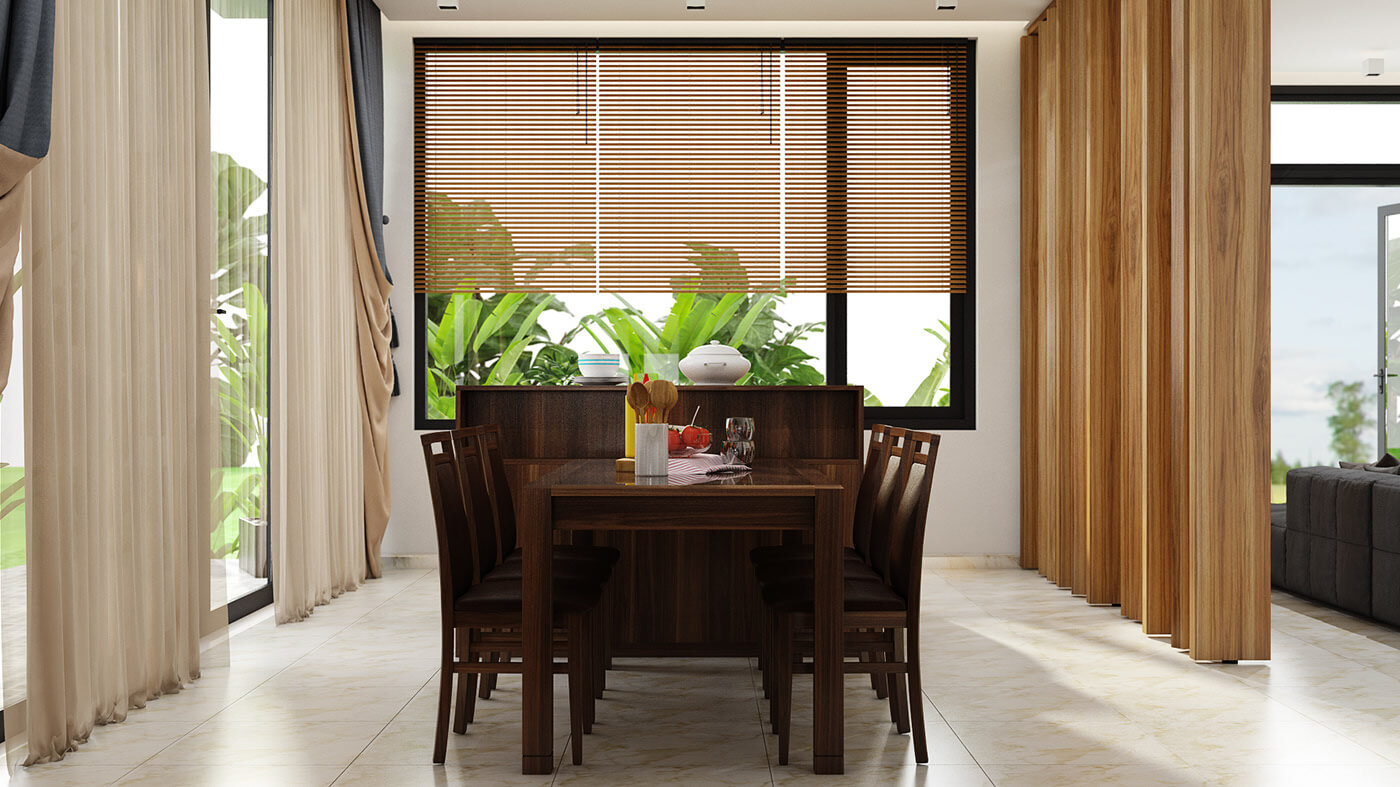 - Phía sau là phòng ăn rộng, đây cũng là nơi các thành viên trong biệt thự vườn 1 tầng tân cổ điển có thể tụ tập chuyện trò hoặc các con của chủ nhà có thể học bài, giải trí tạo sự gắn kết giữa các thế hệ trong nhà.